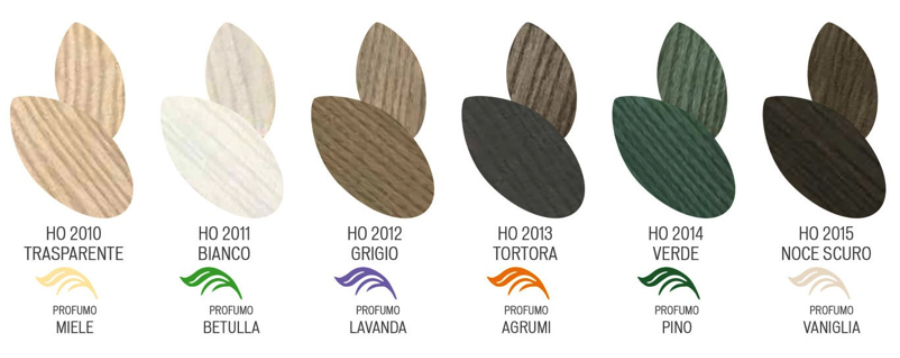 Su legno impregnato o grezzo applicare a pennello la nuova serie di oli decorativi profumati disponibili in alcuni colori con profumazioni naturali HO20XX, e nelle possibili colorazioni: